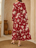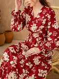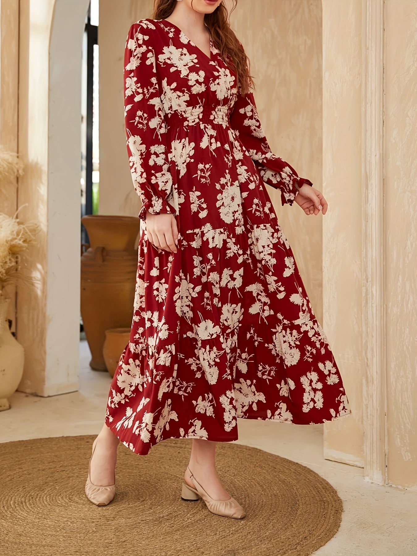 Stunning Floral Ruffle A-Line Dress - Elegant Surplice Neck, Long Sleeve, Shirred Waist, Comfortable Fit for Fall - Women's Clothing for Everyday Wear