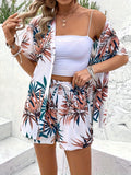 Women's Leaf Print Two Piece Set - Open Front Top & Drawstring Shorts